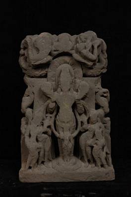 | Description / विवरण | Standing statue of god Surya, dressed in western style Udichya vesa . He holds full blown lotuses in both of his upraised hands. Attendant figures are shown flanking him, on lower side and flying celestials on the top. Faces of all the figures are completely gone. |