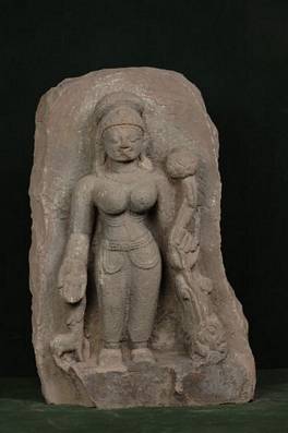 | Description / विवरण | Statue of a standing female deity. She holds a complete lotus creeper in her left hand, right hand is lowered in Varada mudra. A deer is present on her right side near the feet. Her hair are tied in shape of a thick bun on the top. She also puts on various ornaments. Workmanship is of coarse quality. |