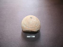 | Description / विवरण | Terracotta bead, nut-shell shaped big size, may be plumbob , well baked, red colour, flat base. |
