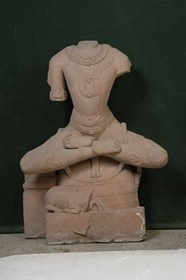 | Description / विवरण | The statue lacks head, the arms and a part of pedestal. God is seated on a high cushioned pedestal with the knee projecting far beyond the edges of the seat. He wears a beautiful necklace and a beaded chain. Beneath is a bull resting before a small arched niche. |
