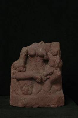 | Description / विवरण | Skandamata headless seated in lalitasana on lion mount, holding infant Skanda in her lap. |