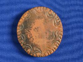 | Description / विवरण | Handmade red slipped disc. Nail cut design all around on both sides. |
