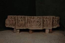 | Description / विवरण | In the center are Uma and Mahesvara embracing each other. The god is four-armed, the lower right hand in varada mudra, the upper right hand holding a trisula, the upper left a serpent, while the lower left hand is not visible. On his knee is seated Uma, her right hand around the god s neck, her left holding a curved mirror. On either side are mithuna figures in niches. |