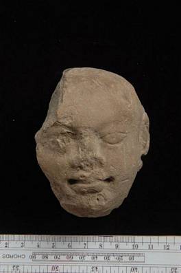 | Description / विवरण | Terracotta head. Right side of the face damaged. Nose highly injured. Eyes seen to be incised. Shaven. |