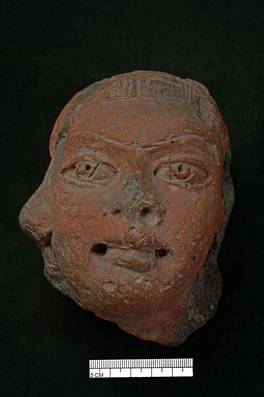 | Description / विवरण | Terracotta head having prominent eyes. Hair arranged. Nose and ears lost. |