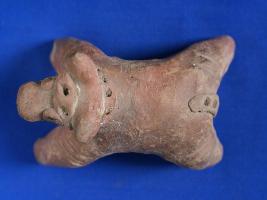 | Description / विवरण | Fragment of Unidentified animal in a good condition. Eyes, neck, tail and forehead is indicated by appliqu and incised design. Both horns are safe. Nose has a transverse hole throw the mouth. Indicated that figurine was use as toy. Handmade to red colour. |