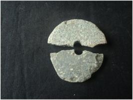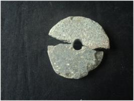 | Description / विवरण | This stone object is a spindle wheel. It is divided into two pieces due to broken. Hole mark is noticed on the center of the object. It worked as a spinning wheel to holding a ribbon in a textile by which the thread is twisted |