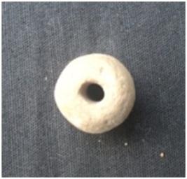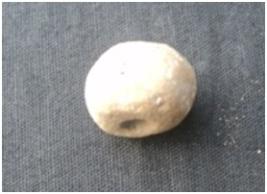 | Description / विवरण | It is a circular terracotta Bead with having a hole. Flat at one end. Another side end of the object has slightly broken. Deep hole marks and cut marks are showing on the body of the object. |