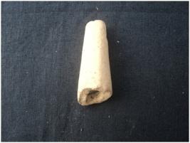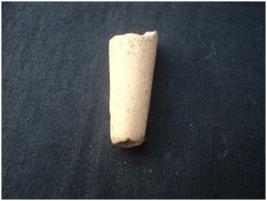 | Description / विवरण | This broken terracotta piece is a part of spout. It has a deep hole on the center of the object. It looks like a pipe in shape. One side of the object is brood wider than compare with other side of the object. |