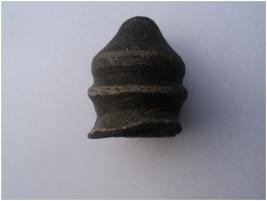 | Description / विवरण | This terracotta object is a knob. A part of lid . It has been designed like upper portion or top portion of the knob is in conical shape. Center part is can cave shape with a projection on the middle. Base of the object also in the can cave shape |