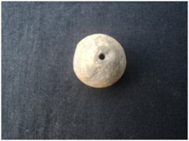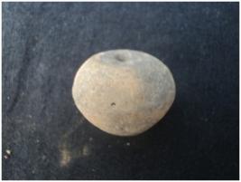 | Description / विवरण | This terracotta bead is in Aracanut shape. One of end of the bead is flat with incised circle line. It has hole. Most part of body has been broken. |