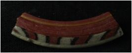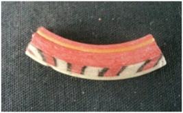 | Description / विवरण | It is a fragmentary small broken piece of a thin rounded bangle of glass material with a design of lines is also showing. Black, Red and grey colour are used in this Bangle. |