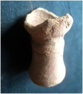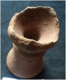| Description / विवरण | Terracotta Chillam Hooka with having perforation. Lower portion of the Cjillam has been broken. Upper portion end is flat with rounded shape. Slightly projecting circle band is noticed on the middle portion of the object. |