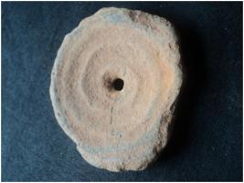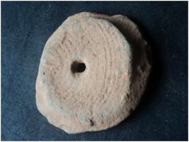 | Description / विवरण | Base of a broken Bowl, decorated with spiral circle in inner portion of the base with having a hole. There are some lines are having on the outer surface of the object but that is not clearly visible. Edges of the |