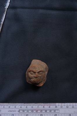 | Description / विवरण | Small terracotta head having wrinkles on the forehead. The teeth coming cut from mouth. Eyes seem to be closed. |