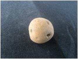 | Description / विवरण | Terracotta Arecanut shaped bead with having six perforations. A deep crack marks is also noticed on the object. |