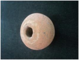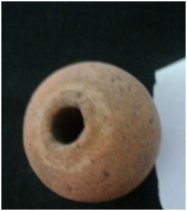 | Description / विवरण | Terracotta long barrel shaped bead. One end of perforation has been broken slightly. |