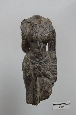 | Description / विवरण | Headless Yakshi figure broken below the knees. She is carrying a cauri in right hand while left hand is rest in side. Both of hands are filled with bangles. Narrow shoulder and large breast is decorated with necklace. Waist is narrower but expanded in heap area. There is a girdle surrounded the lower waist portion. Though upper body is bare but lower body draped with cloth. Various plates of cloth is visible. Backside of object showing the detail of ornamentation. Thick necklace covering the upper shoulder while many-stranded girdle surrounded the heap. Two long plaits are coming down till waist. |