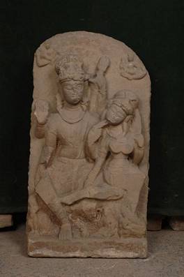 | Description / विवरण | Sculpture showing a badly weatherworn seated figures of Umamaheswara. Siva is four armed and Uma sits on his top. Siva touches the chain of Parvati with his fingers. Below the seat there is a bull and a gana.The image is badly weatherworn and the faces have been recut. |