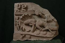 | Description / विवरण | Four-armed Visnu reclining on the coils of Adisesa with the upper right hand supporting his head and the lower holding gada and the left hands bearing cakra and sankha. From his navel issues a lotus stalk but the emerging figure of Brahma is fully defaced. Visnu s figure is broken below thighs and only the proper right corner of the upper part showing a pair of devotees is preserved. |