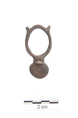 | Description / विवरण | Circular hollow ring with two ears in two corners. This round portion is joined with solid circular flat base. There is narrow portion in between round and solid circular portion. This solid circular portion contains deep depression in middle. |