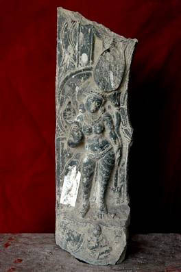 | Description / विवरण | Fragment of a stele. A female attendant of the central deity of the stele with a halo around her head. |