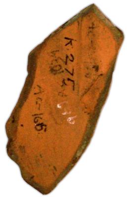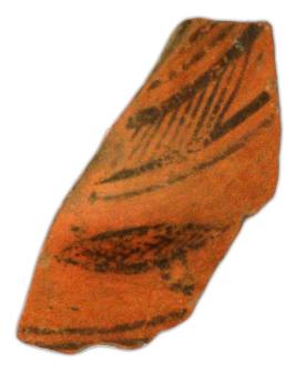 | Description / विवरण | Broken piece of a fine painted block on red ware with moving fish shown in-between band of designs. The intact band shows slanting lines drawn in black colour pigment in between concentric lines. |