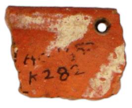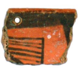 | Description / विवरण | Fragment of a painted black on red ware bowl with perforation below the rim. Application of fine slip on both sides. Incurved blunt thick rim. Thick broad line is drawn in black colour below the rim inside and externally there are horizontal lines with in a box |