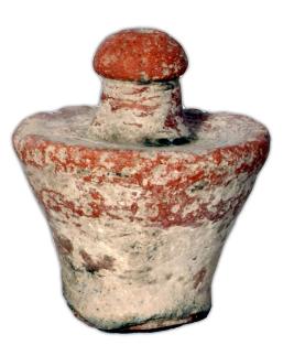 | Description / विवरण | Broken red ware lid with handle topped by domical knob with a perforation and a hole at the flat bottom. |