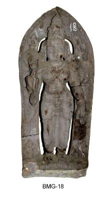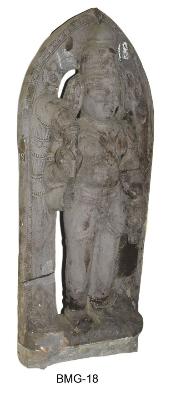 | Description / विवरण | Dwarapala standing straight with chamara and gada. But the latter is mising. It is in shala. Chamaradhari having the symbols of sankha and chakrai on torana which was present just above the head of the image. The figure holds chamara in right hand, it has to clear identification of thread lines. Lower part chamara broken damaged into layers. |