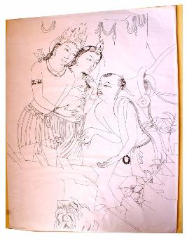 | Description / विवरण | Copy of Ajanta painting drawn in lines with pencil. Probably represents a part of Simhala avadana. The picture shows a Covetous Brahmin, King and Queen in royal palace. |