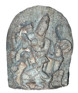 | Description / विवरण | Mahishasuramardini keeping her left leg firmly placed on the ground and her right leg on the back of the animal. She is piercing the demon who came out on the body of the animal with her pointed trident holding with both the hands. She holds shield and bana in her upper left hands and arrow with her raised upper right hand and stabbing another asura with her middle upper right hand holding a sword. There is queir with full of arrows tied on the back of her right shoulder. Her vahana, lion is shown on the left side behind the Mahisa. She has square face wearing high karandamakuta, kundalas, kanthaharas, a long necklace hanging between the breast, bhahuvalayas, armlets, wristlets and anklets. Facial features abraded. |