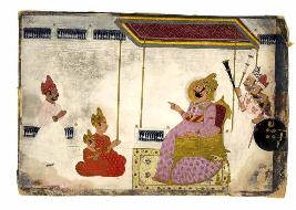 | Description / विवरण | Raja seated on a royal chair under a canopy giving instructions to seated and standing persons, behind him there are three standing soldiers. |