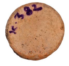 | Description / विवरण | Spool shaped ear ornament with four big triangles on four directions and small triangles in between each big triangle, each triangle again is depicted with a row of triangles confluence at the centre. The periphery is also incised with triangles, ventral side is plain, grey in colour. |