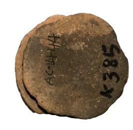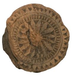 | Description / विवरण | Spool shaped ear ornament with flower at the centre having multiple petals enclosed by a circular beaded design, it is enclosed by a row of triangles at the periphery, partly broken, plain ventral surface, grey in colour. |