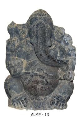 | Description / विवरण | Four handed Ganesa seated in sukasana posture. He held parasu and a full-blossomed flower in his two upper hands . He is carrying a danta tusk in the front right hand and his trunk placed on the modaka held in the left hand. He wears simple ornamental headgear, kanthamala, three stranded yajnopavita, nagaudarabandha, anklets, armlets and wristlets. A broken tusk is seen on his left side of the trunk. |