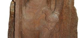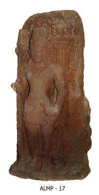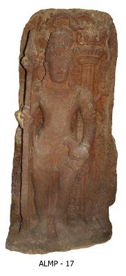 | Description / विवरण | Kartikeya standing in samapada sthanaka posture. He wears dissimilar kundalas, kiritamakuta, kanthamala, yajnopavita, katisutra, mekhala, ardhoruka with loops hanging down, nagakeyuras angada and kankans. He holds a staff with pointed head upwards and placed his left hand on the waist holding kukkuta. An ornamental prabhavali is seen on the rear side prominently. He is shown with round face, long snubbed nose, almond shaped eyes, fleshy cheeks, blunt chin, and other iconographical features clearly indicates the Early Art School of the Chalukyas. |