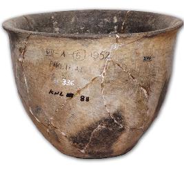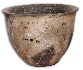 | Description / विवरण | Polished Chalcolithic grey ware deep bowl with flat base and convex shoulder, slightly thickened averted rim, application of fine slip, black patches on the body. |