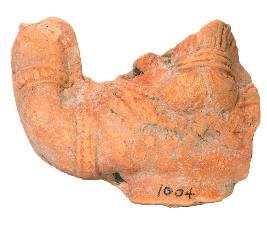 | Description / विवरण | Broken figure of female. It shows raised right hand. She wears a necklace, Keyura and a wrist-band. The hair was looped closed to the head in an elongated top knot at the back of the head. It is prepared by double mould technique. |