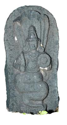 | Description / विवरण | Naga with half upper human body and half lower coiled tail. He is shown holding a circular shield with slightly projected circular disc at the centre and a sword in his raised right hand. He wears decorated karandamakuta, long ear lobes with circular kundalas, kanthahara with circular pendent, long necklace with trilobed pendent, beaded yagnopavita, and thick waist-band. |