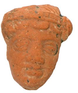 | Description / विवरण | Head of a male figurine with a head dress turban showing side fastening angarkha with tassels hanging on the forehead. It shows protruding eye balls, stout nose with thick lips. |