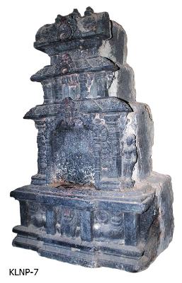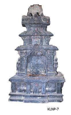 | Description / विवरण | Three tiered decorated kostapanjara with an ornamental niche at the centre without image. There are attendents holding fly whisks in their right hands standing on either side of the niche. Below the niche are three lions. The seated lion at the centre is flanked by rampant lions. Each one is separated by pilaster motifs. The upper tier with a central niche without image is topped by a rectangular kalasa motif with a finial depiction broken . Basing on depiction of the lion motifs on the pedestal, it is presumed that central niche in kostapanjara is meant for Mahavira 24th Jaina thirthankara . |