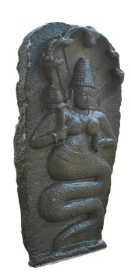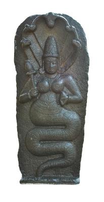 | Description / विवरण | Nagini standing on its coiled tail holding stalk of a flower in her raised right hand and flower bud with her left raised hand. She wears kanthahara with hanging pendent between her breasts, long ear lobes with circular kundalas, waist band and tiered karandamakuta. Scales are shown with horizontal marks. Five hooded naga over her head is neatly delineated. |