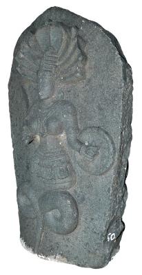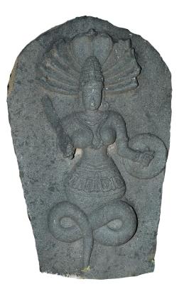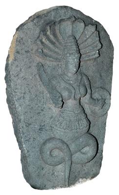 | Description / विवरण | Nagini standing on coiled tail holding a circular shield with her left hand and a sword mutilated with her right raised hand. She wears a tight kanthahara, a double stranded long necklace passing through her breasts, armlets, wristlets, circular kundalas, stepped kiritamakuta and ornamental mekhala with looped tassels all around. Seven hooded snake. slightly mutilated on the left side . |