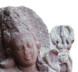 | Description / विवरण | Dwarapala, represented with four hands. He holds Trident and battle axe in his two rear hands. His right fore hand is kept on the waist, while his left hand is placed on the mace. He wears ornamental kiritamakuta, patra kundalas, angada naga keyuras , beaded wristlets, mekhala tied with beaded bands, yajnopavita, kanthaharas. The lower portion below the knee is broken and missing. |