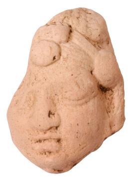 | Description / विवरण | Head of a female figurine with a band across the forehead tied up with large ornamental devices on either side and a prominent crest jewel hanging down on the forehead, suspended from the tied up hair Upasa . She shows smiling face with thick lips, elongated pointed nose. |