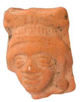 | Description / विवरण | Head of a male figurine wearing a turban decorated with makarika. He also wears patrakundalas. Smiling face with closed eyes, elongated nose. |