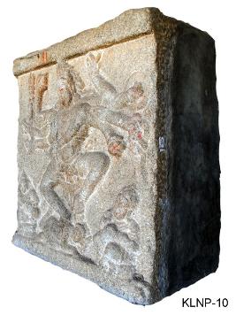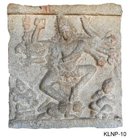 | Description / विवरण | Siva as Nataraja carved in a niche between two thick horizontal banded frame. He is represented with ten hands and dancing on apasmarapurusha. His two front hands are in gajahasta. He holds trisula, pasa, damaru, khadga, chakra,snake, ghanta and knife in his upper right and left hands. He wears karandamakuta with side hair locks flowing on either side over the shoulders, anklets, wristlets, keyuras, kanthaharas, yajnopavita, kundalas, purnorukha tied with ornamental waist-bands with hanging tassels between the legs. There are musicians on either side at both the corners of the panel. He has oval face with long snubbed nose, slightly protruded eyes, fleshy cheeks and pointed chin. Other features slightly abraded. |