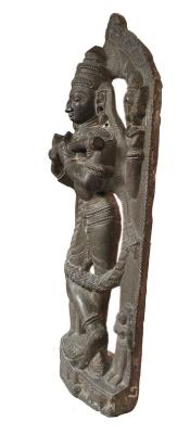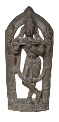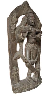 | Description / विवरण | Krishna standing in tribhanga posture on a pedestal, which is decorated with a lotus motif at the centre and flanked by cows on either side. He holds flute with his fore hands and holds chakra in his upper right hand and sankha in his left hand. He wears anklets, pattas, purnoruka tied with waist-band, ornamental mekhala, a long flower garland hanging from one shoulder to the other, yajnopavita, chest-band, kundalas, and ornamental conical head gear. There is an ornamental prabhamandala with attendents at the bottom and kirtimukha on the top. |