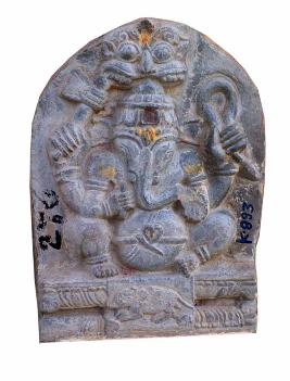 | Description / विवरण | Ganesa seated. Four armed. The two rear hands hold battle axe and noose. The front right hand holds some indistinct Object while front left hand holds the modaka. The head dress is karandamakuta with makaratorana motif on the top. The ornaments include armlets, anklets and nagaudarabandha. |